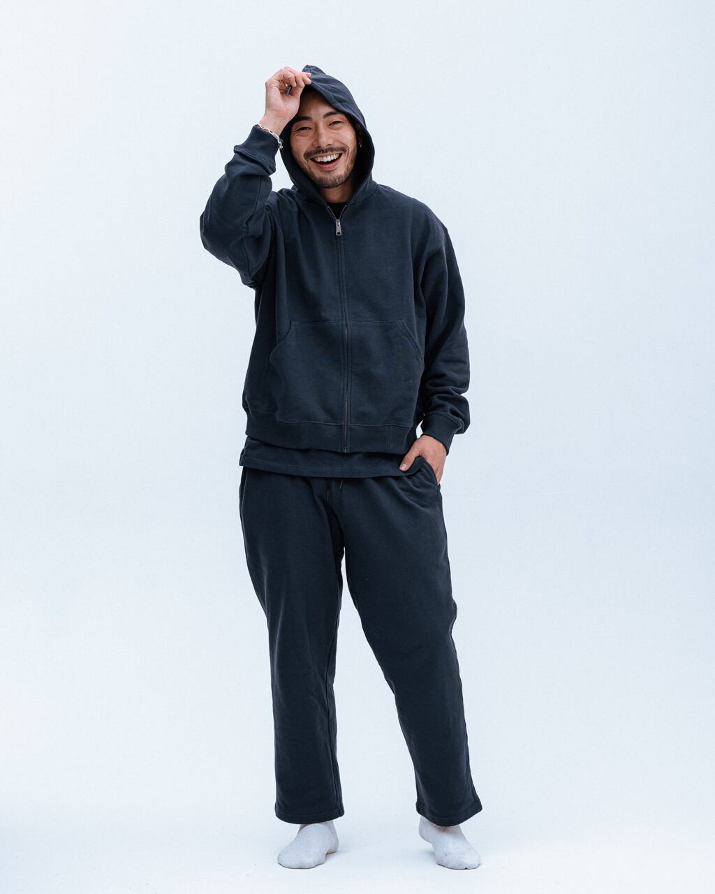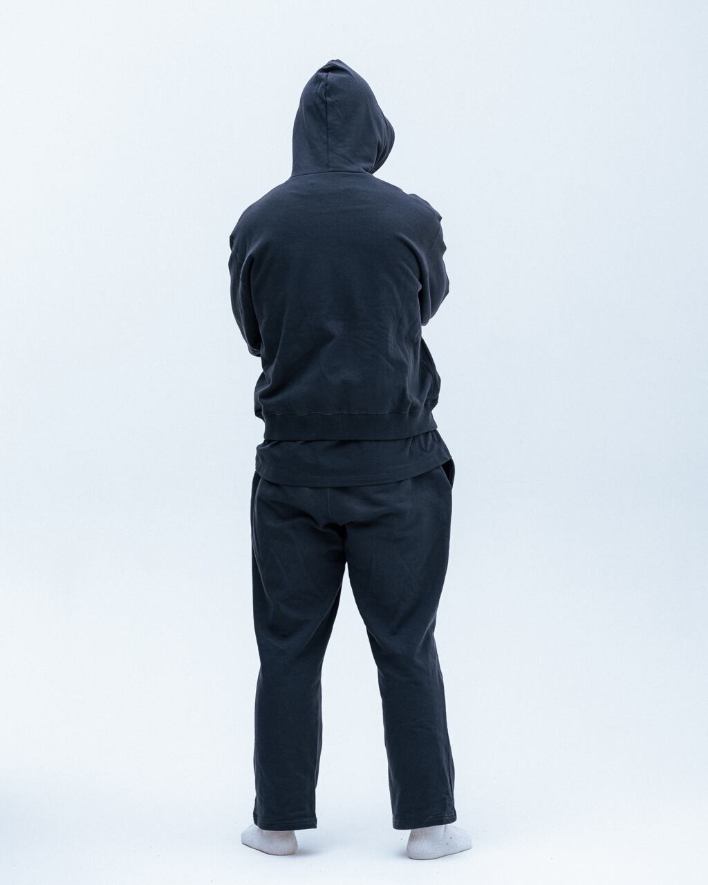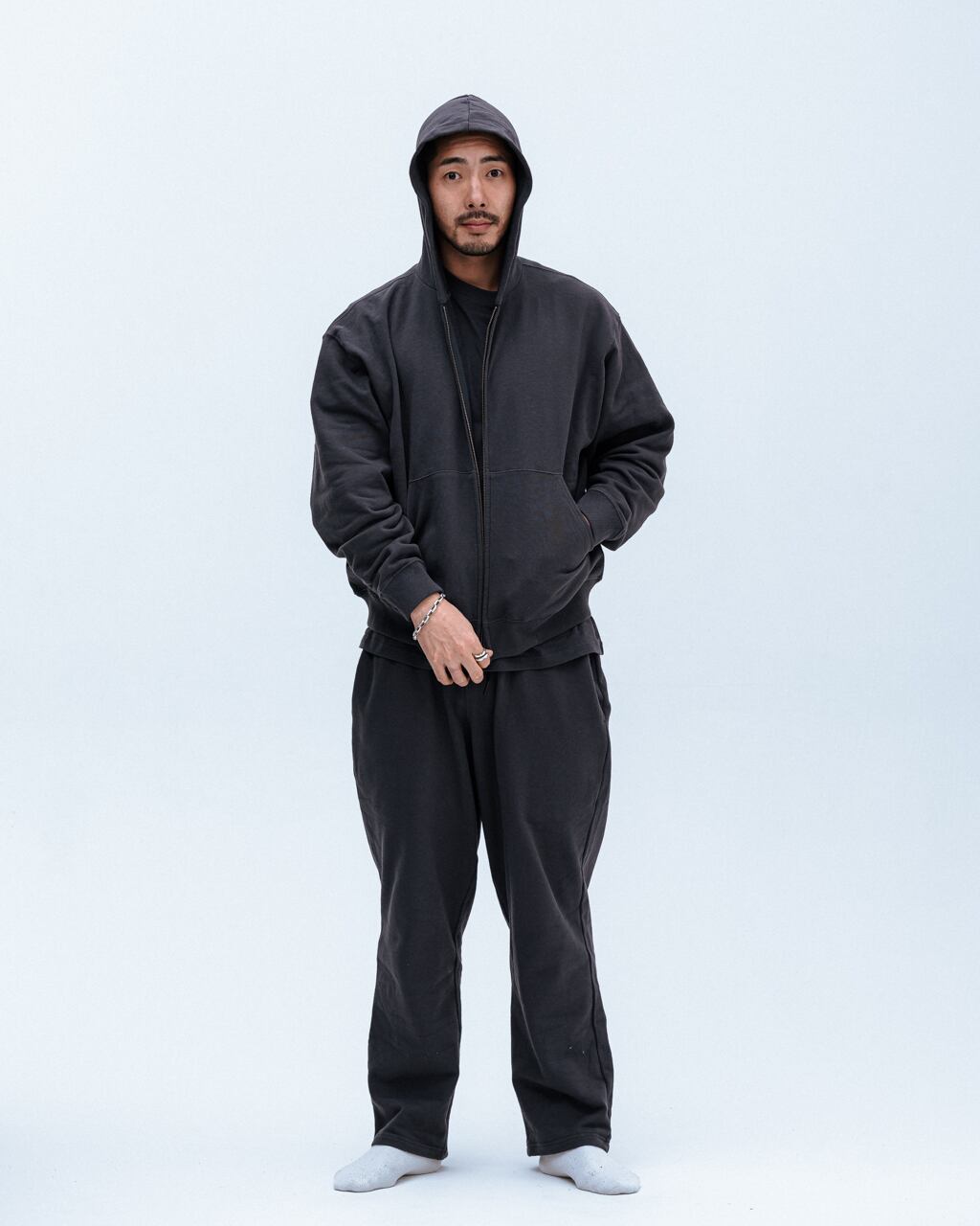 裾のリブが綺麗に落ちるよう設定された身幅、裏地無しで軽く被れるフード、袖は長めで太くゆったりとしたバランスのコージーなシルエットのパーカー。