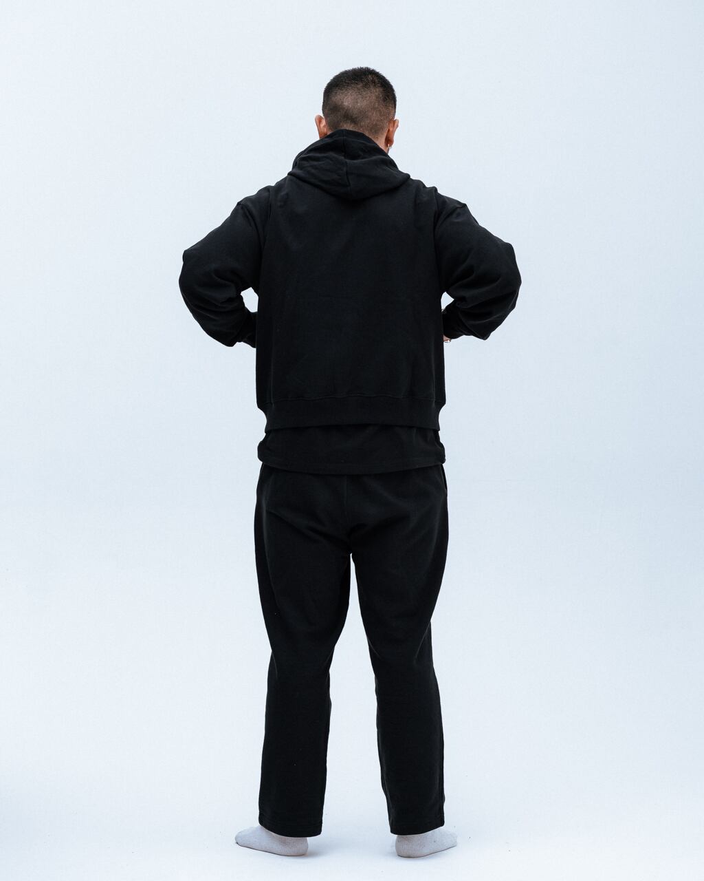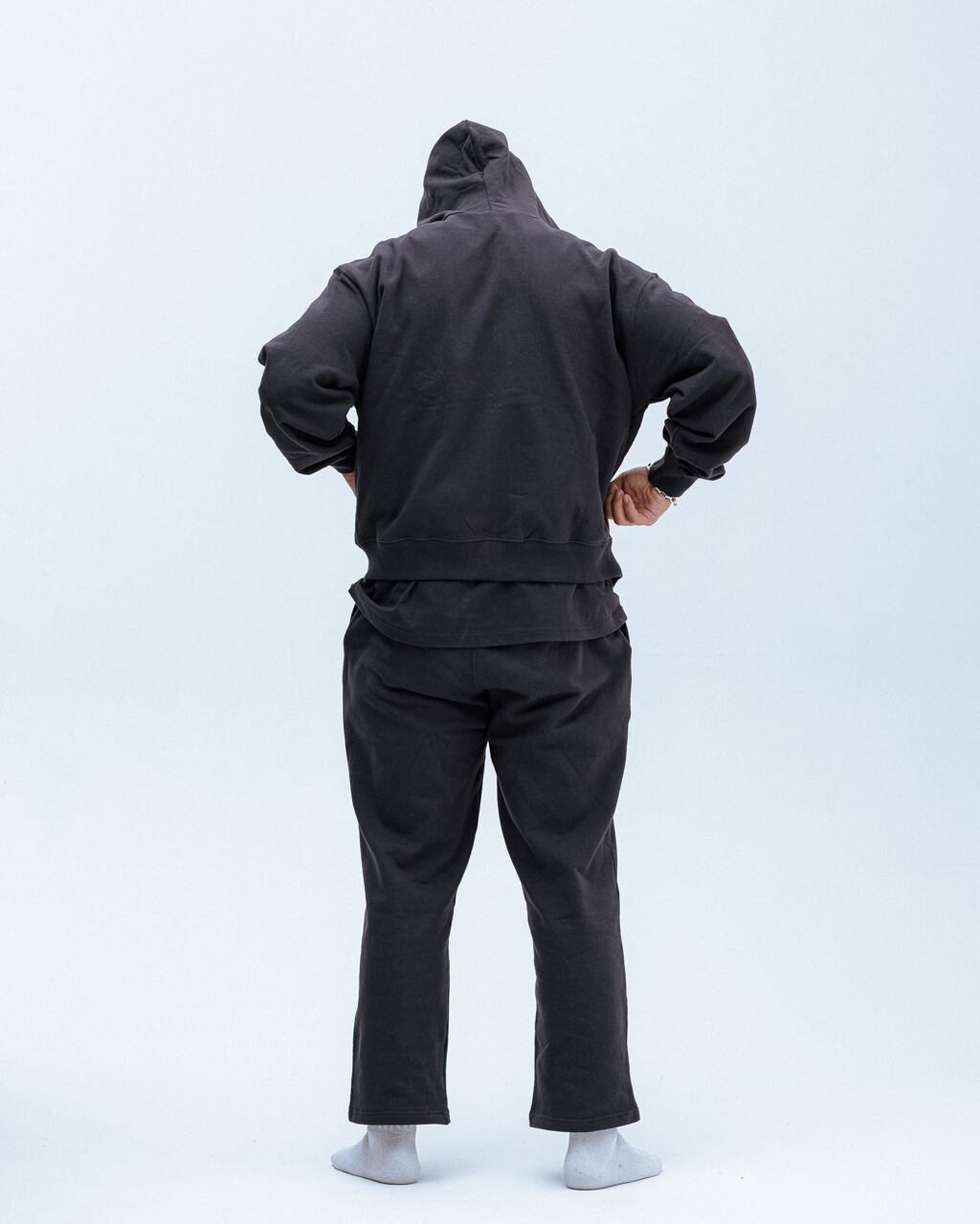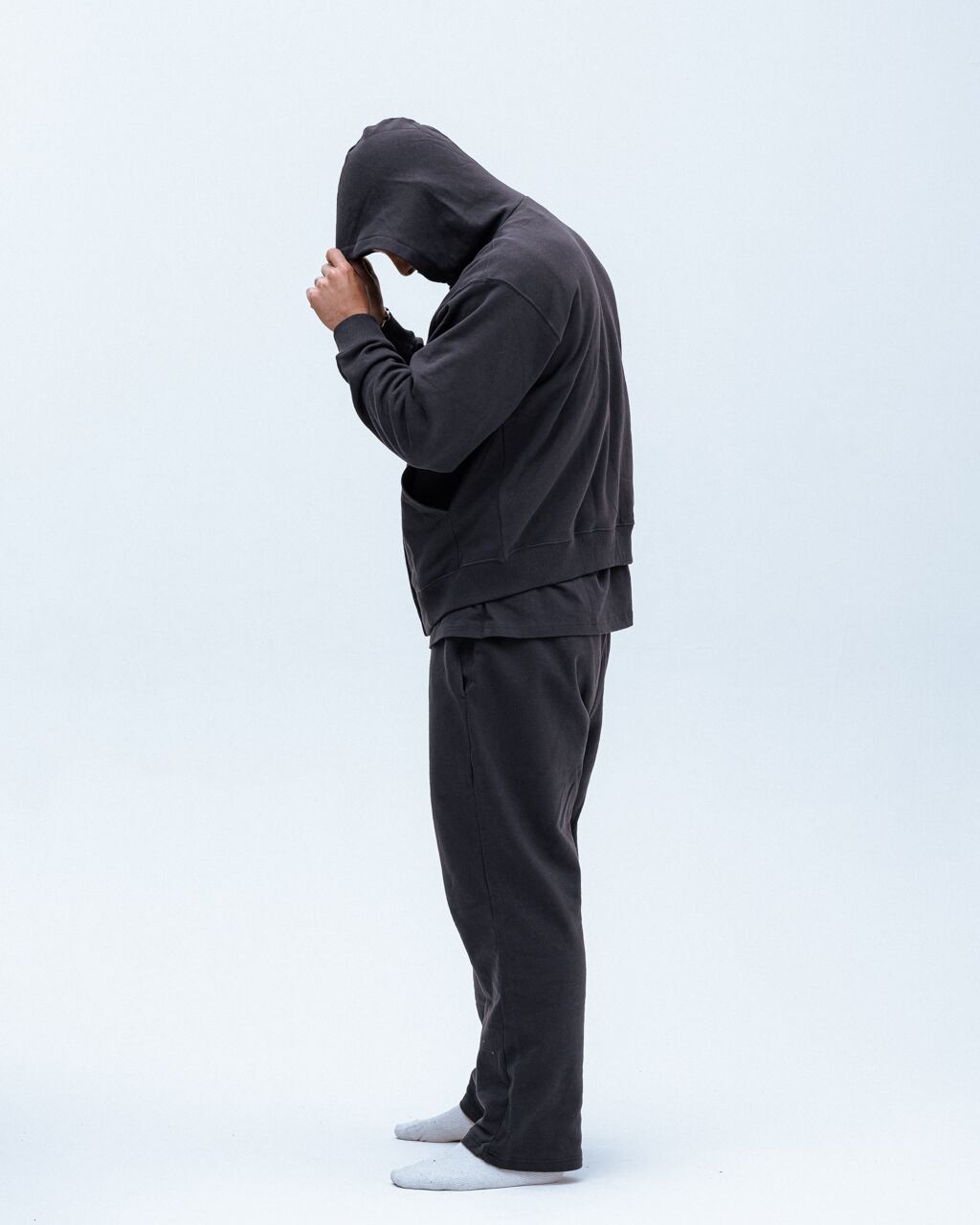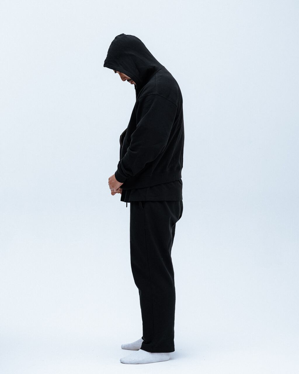 裾のリブが綺麗に落ちるよう設定された身幅、裏地無しで軽く被れるフード、袖は長めで太くゆったりとしたバランスのコージーなシルエットのパーカー。