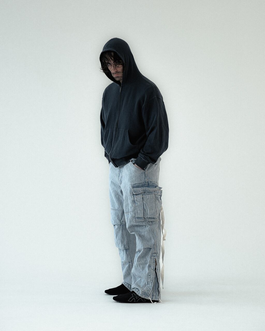 岡山産デニムをアイスブリーチしたデニムカーゴ。